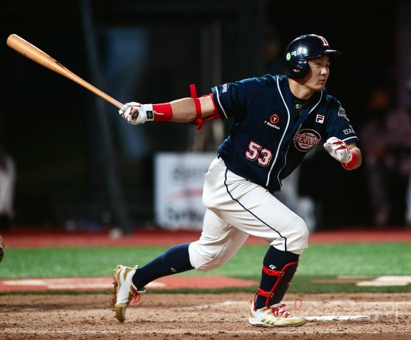 4회초 1사 만루 두산 최주환이 좌전 2루타를 날리고 있다.