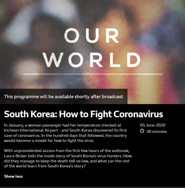 BBC는 편성을 확정하고 오는 5일 밤 12시30분(현지시간)에 OUR WORLD 코너를 통해 첫 방송할 예정이라고 밝혔다. 전 세계 이슈에 관한 시사 다큐멘터리를 방송하는 OUR WORLD에서는 한국의 코로나 바이러스의 대응에 대해 커다란 관심을 갖고 주말 저녁 등 여러 차례 재방송 계획도 밝혔다.