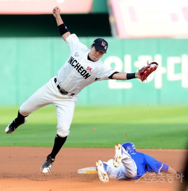 4회초 무사 1루에서 삼성 살라디노 타석 때 1루 주자 박찬도가 SK 최항의 태그를 피해 2루 도루에 성공하고 있다.