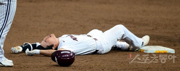 3회말 2사 키움 김하성이 좌전 안타를 치고 2루까지 달렸으나 아웃되는 과정에는 부상을 당해 고통스러워하고 있다.