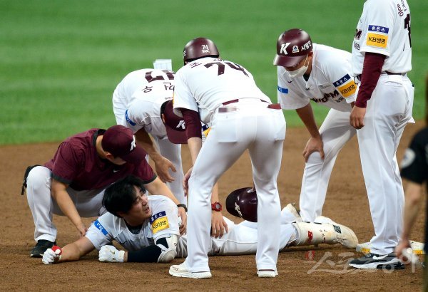 3회말 2사 키움 김하성이 좌전 안타를 치고 2루까지 달렸으나 아웃되는 과정에는 부상을 당해 고통스러워하고 있다.