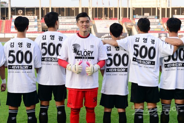 성남 김영광이 자신의 500경기 기념 티셔츠를 입은 동료들과 포즈를 취하고 있다.