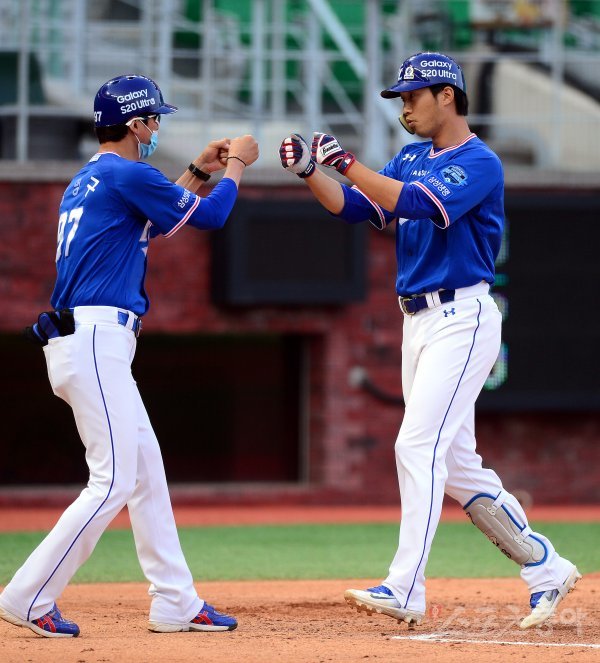8회초 무사에서 삼성 이학주가 솔로 홈런을 쏘아 올린 뒤 강명구 코치의 환영을 받고 있다.