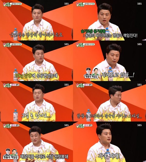 그는 “조절하려고 하는데 시각효과에 굉장히 약하다. 채널을 돌렸는데 먹는 게 나오면 못 참는다. 전단지를 받으면 한참 고민하다가 결국 시킨다. 형들이 전단지와 배달 어플을 지워버렸다”고 털어놨다.