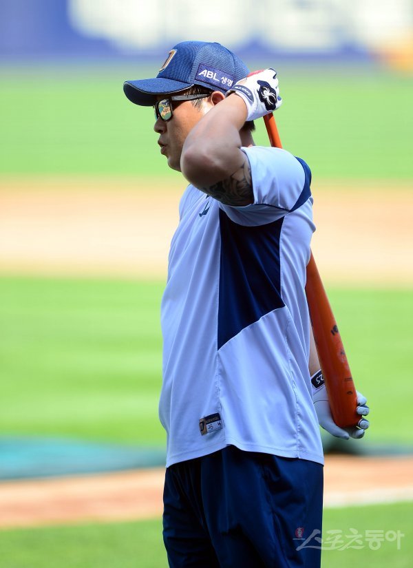 NC 양의지가 훈련 중 배트로 등을 마사지하고 있다.