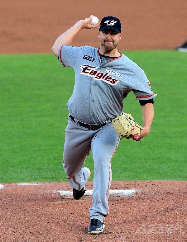 한화 선발투수 서폴드가 힘차게 볼을 던지고 있다.