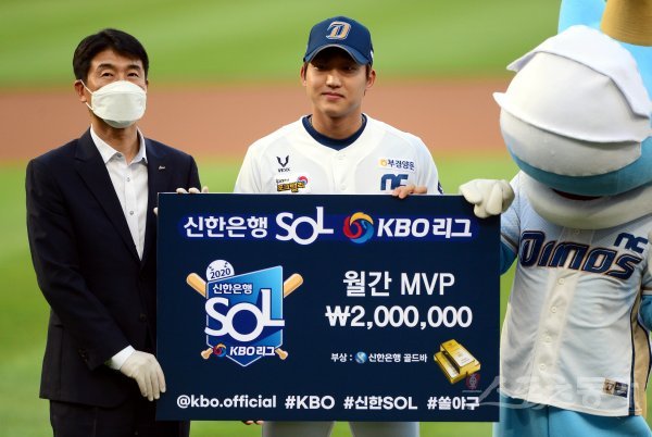 NC 구창모가 경기를 앞두고 KBO 5월 MVP로 선정돼 수상하고 있다.