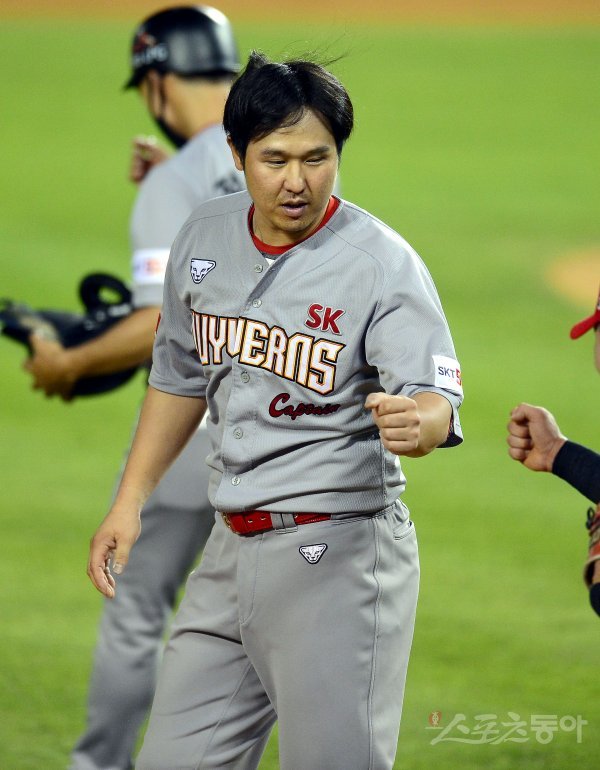 8회초 2사 2루 상황에서 다시 앞서가는 1타점 2루타를 친 SK 최정이 공수 교대 때 주먹을 맞대고 있다.