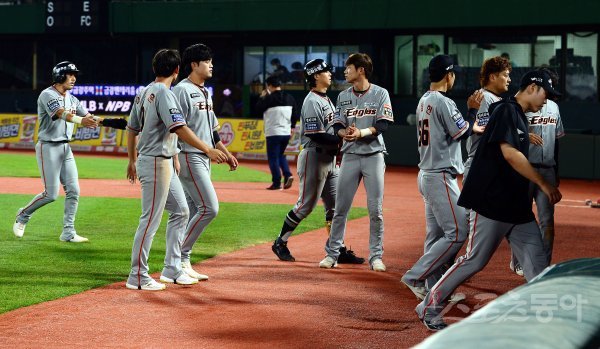 3-9로 롯데에 패하며 구단 역사상 15연패에 빠진 한화 선수들이 경기 종료 후 그라운드를 빠져나가고 있다.