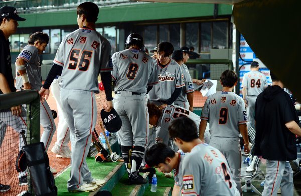 3-9로 롯데에 패하며 구단 역사상 15연패에 빠진 한화 선수들이 경기 종료 후 더그아웃을 빠져나가고 있다.
