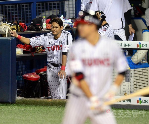 9회말 1사 만루 상황에서 외야 뜬공으로 물러난 LG 박용택이 더그아웃에서 아쉬워하고 있다.