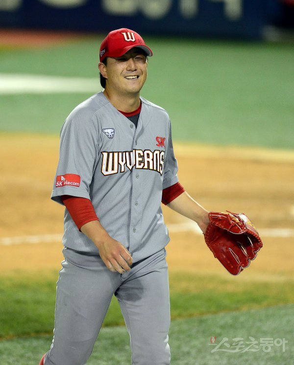 9회말 2사 만루 상황에서 외야 뜬공으로 이닝을 마친 SK 조영우가 웃고 있다.