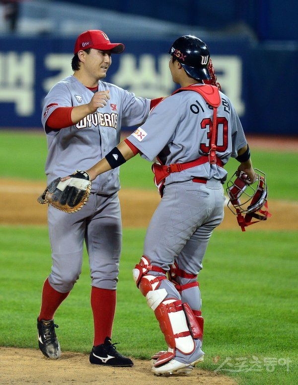 연장 접전 끝에 5-3 승리를 거둔 후 SK 승리투수 조영우가 포수와 포웅하고 있다.