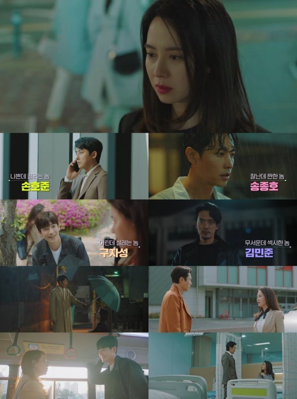 JTBC 새 수목드라마 ‘우리, 사랑했을까’(극본 이승진, 연출 김도형, 제작 JTBC스튜디오, 길 픽쳐스, 이하 ‘우리사랑’)는 14년차 생계형 독수공방 싱글맘 앞에 나쁜데 끌리는 놈, 짠한데 잘난 놈, 어린데 설레는 놈, 무서운데 섹시한 놈이 나타나면서 두 번째 인생의 시작을 알리는 ‘4대 1 로맨스’다. 오늘(10일) 공개된 영상은 ‘노(No)’뿐이었던 노애정(송지효)의 인생에 파란만장하게 펼쳐질 ‘애정사’를 예고하고 있다. 특히 노애정과 ‘놈놈놈놈’ 각각의 투샷이 최초 공개돼 흥미로운 눈호강까지 선사하고 있다.