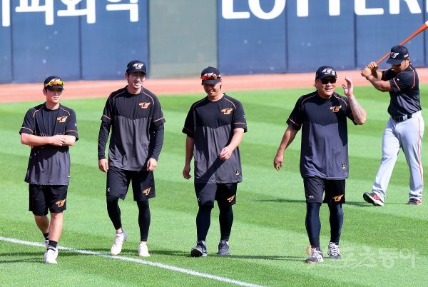 경기 전 한화 정은원(왼쪽부터), 정진호, 노시환, 김태균이 훈련을 준비하고 있다.