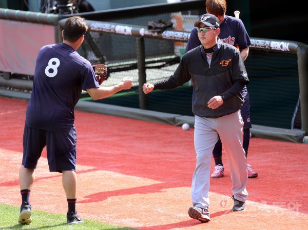 경기 전 한화 최원호 감독대행이 롯데 전준우와 하이파이브를 나누고 있다.