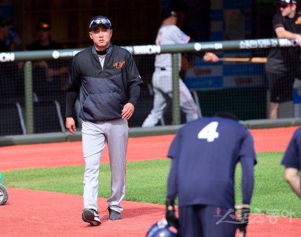 경기 전 한화 최원호 감독대행이 롯데 더그아웃을 향해 걸어가고 있다.
