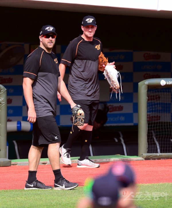 경기 전 한화 서폴드와 채드벨이 훈련을 준비하고 있다.