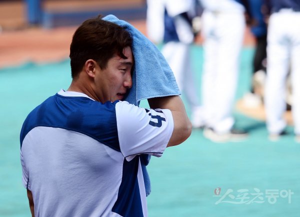 NC 나성범이 훈련을 마친 뒤 땀을 닦고 있다.