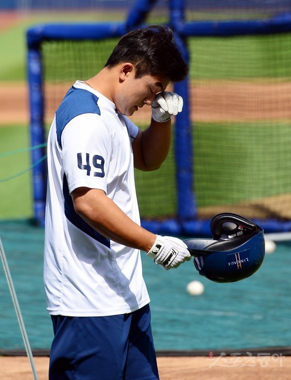 NC 강진성이 훈련 중 눈을 비비고 있다.