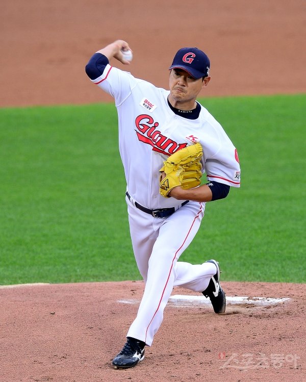 10일 부산 사직야구장에서 ‘2020 신한은행 SOL KBO리그’ 롯데 자이언츠와 한화 이글스의 경기가 열렸다. 롯데 선발투수 노경은이 힘차게 볼을 던지고 있다.