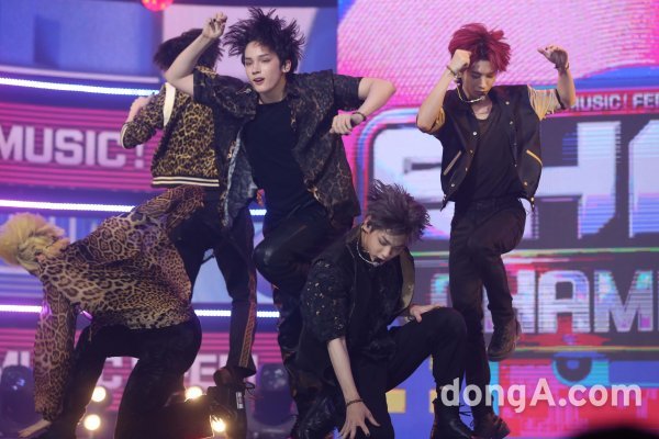 그룹 투모로우바이투게더가 10일 오후 경기 일산 드림센터에서 열린 MBC M 음악프로그램 생방송 \'쇼 챔피언\'에서 새로운 무대를 선보이고 있다.