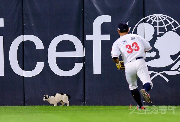 8회초 한화 공격 때 롯데 허일이 외야에 나타난 고양이를 향해 달려가고 있다.