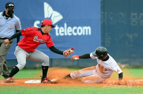 14일 서울 목동야구장에서 ‘제74회 황금사자기 전국고교야구대회 겸 주말리그 왕중왕전’ 광주진흥고등학교와 의정부 상우고등학교의 경기가 열렸다. 1회말 무사 2루 광주진흥고 2번타자 이준서의 타석 때 2루주자 김길모(오른쪽)가 3루로 도루를 시도해 세이프되고 있다.
