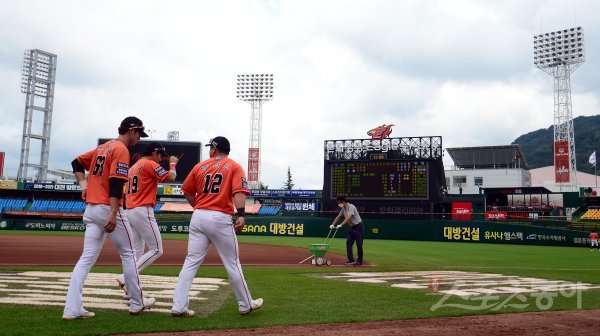 14일 대전 한화생명이글스파크에서 ‘2020 신한은행 SOL KBO 리그’ 두산베어스와 한화이글스의 서스펜디드 경기가 열린다. 전광판에 전날 3회말 한화 공격이 표시되어 있다.