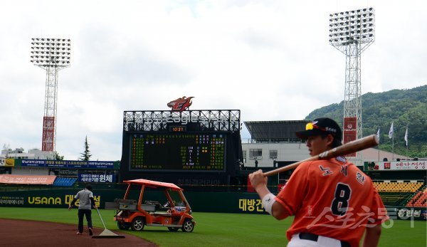 14일 대전 한화생명이글스파크에서 ‘2020 신한은행 SOL KBO 리그’ 두산베어스와 한화이글스의 서스펜디드 경기가 열린다. 전광판에 전날 3회말 한화 공격이 표시되어 있다.