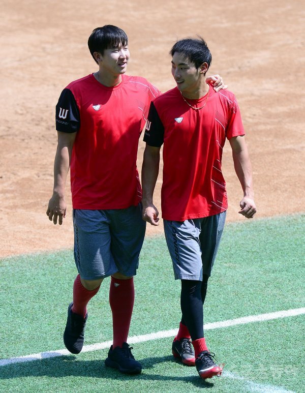 14일 인천 SK행복드림구장에서 ‘2020 신한은행 SOL KBO리그’ SK 와이번스와 KIA 타이거즈의 경기가 열린다. 경기 전 SK 최항과 최지훈이 훈련을 마치고 더그아웃으로 향하고 있다.