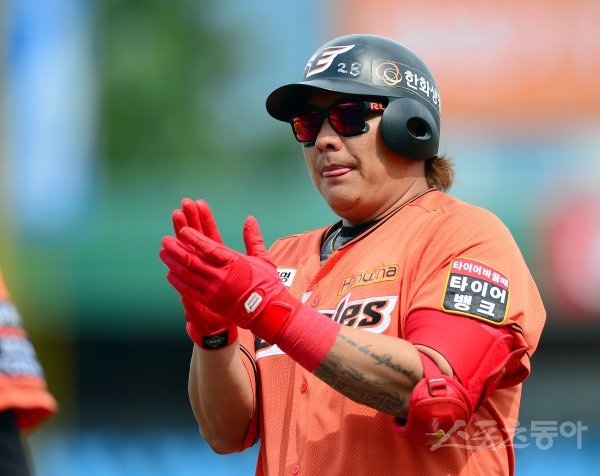 14일 대전 한화생명이글스파크에서 ‘2020 신한은행 SOL KBO 리그’ 두산베어스와 한화이글스의 전날 우천으로 취소된 서스펜디드 경기가 열렸다. 7회말 1사 2루 한화 김태균이 좌전 안타를 치고 1루에서 기뻐하고 있다.