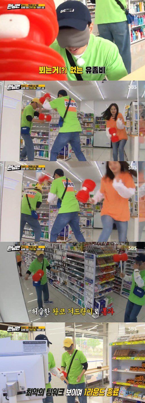 수비가 된 김유정 팀은 뿅망치를 들고 편의점에 들어오는 공격팀을 잡아야 했다. 그런데 수비를 해야 하는 유재석과 지석진은 서로를 때려 웃음을 자아냈다.
