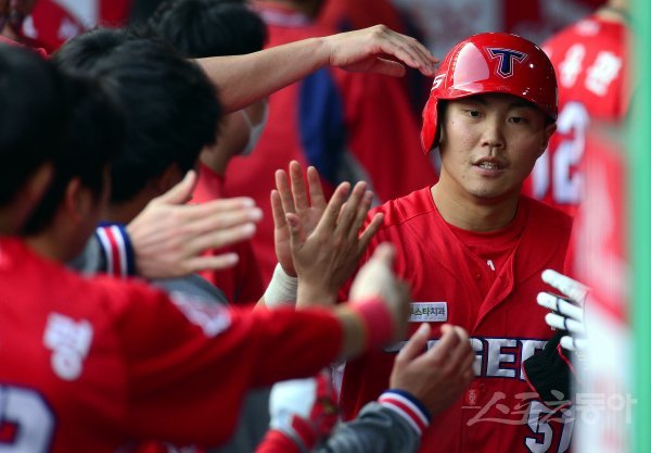 7회초 1사 2루에서 KIA 김주찬의 1타점 적시타 때 득점에 성공한 류지혁이 동료들의 환영을 받고 있다.