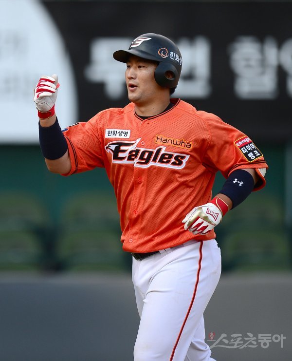 3회말 1사 한화 최재훈이 좌월 솔로 홈런을 날리고 그라운드를 돌아 홈인해 하이파이브 하고 있다.