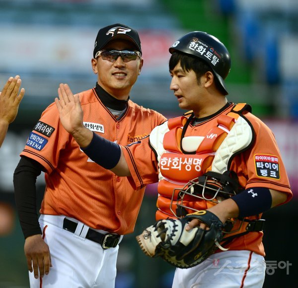 3-2 역전승을 거두며 2연승을 달린 한화 최원호 감독대행이 최재훈과 하이파이브 하고 있다.