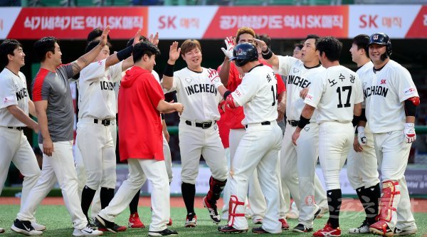 9회말 1사에서 SK 최정이 4-3으로 승리하는 끝내기 홈런을 날린 뒤 동료들의 환영을 받고 있다.