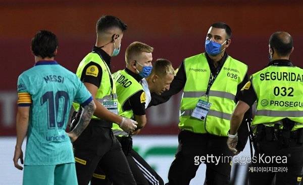 14일(한국시간) 마요르카와 바르셀로나전 도중 일이 벌어졌다. 후반전이 진행되는 동안 아르헨티나 대표팀 유니폼을 입은 한 팬이 그라운드에 나타났다. 무관중 속에 펼쳐지는 경기였지만 그는 아무도 모르게 경기장 내로 들어오는데 성공했다. 2m 정도의 담장을 넘어 경기장 안으로 들어온 것으로 알려졌다. 사진을 찍으려다 경기장 안전요원에게 붙잡힌 그는 “메시와 함께 사진을 찍으려고 했던 것뿐”이라고 해명했다.