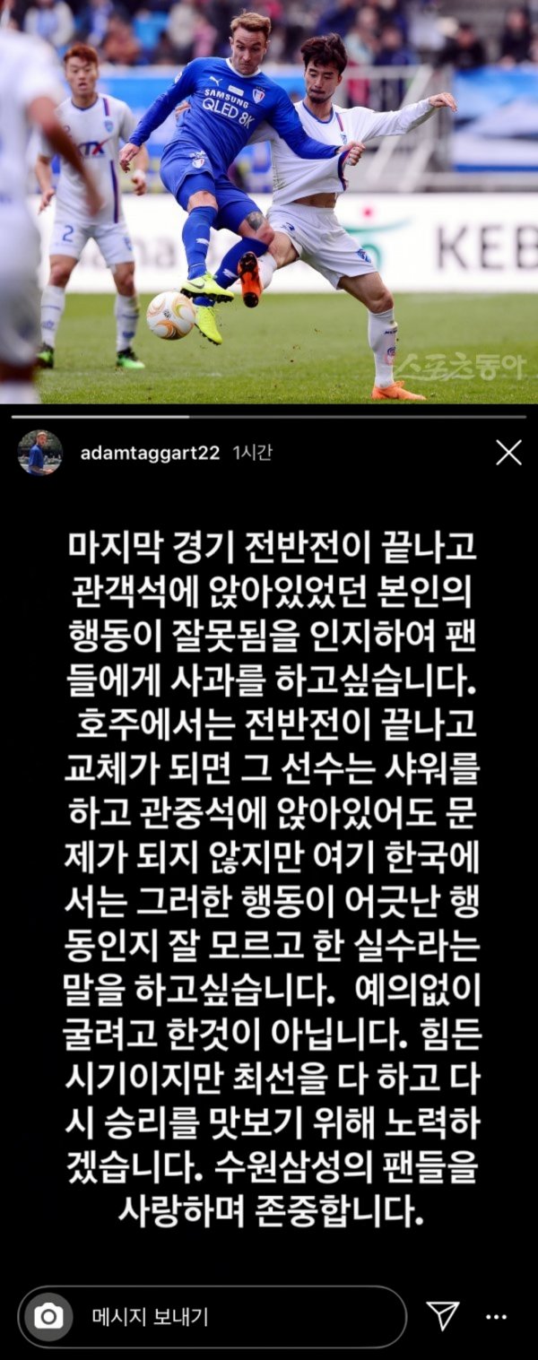 프로축구 K리그1 수원삼성 블루윙즈 공격수 아담 타가트가 태도 논란에 대해 한글로 사과문을 올렸다.