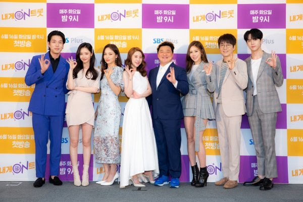 15일 오전에 열린 SBS 플러스 \'내게 ON 트롯\' 온라인 제작발표회에서 출연진이 포토타임을 갖고 있다.