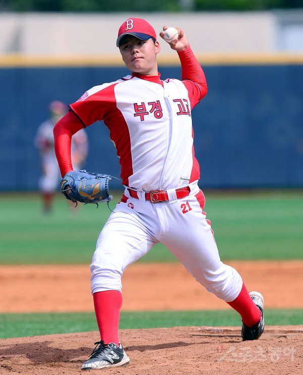 15일 서울 목동야구장에서 ‘제 74회 황금사자기 전국고교야구대회 겸 주말리그 왕중왕전’ 부산 부경고등학교와 서울 충암고등학교의 경기가 열렸다. 부경고 선발투수 이재상이 힘차게 볼을 던지고 있다.