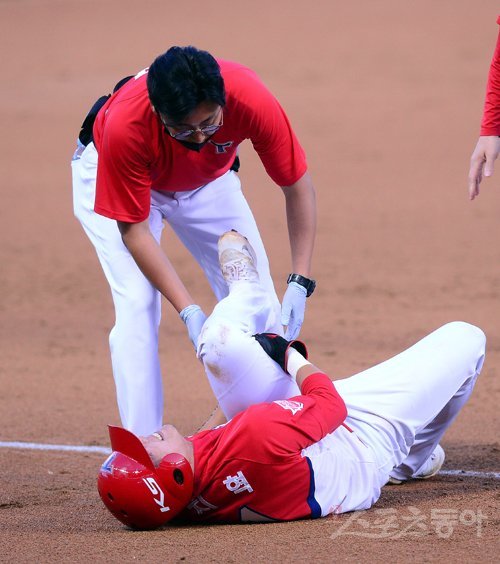 14일 인천 SK행복드림구장에서 ‘2020 신한은행 SOL KBO리그‘ SK 와이번스와 KIA 타이거즈의 경기가 열렸다. 9회초 1사 1루에서 KIA 유민상의 안타 때 3루로 달리던 KIA 류지혁이 부상으로 고통을 호소하고 있다. 인천 | 김민성 기자 marineboy@donga.com