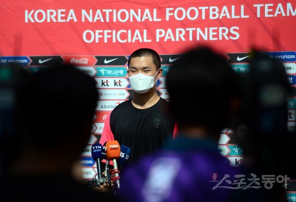 훈련 전 오현규가 인터뷰를 하고 있다.