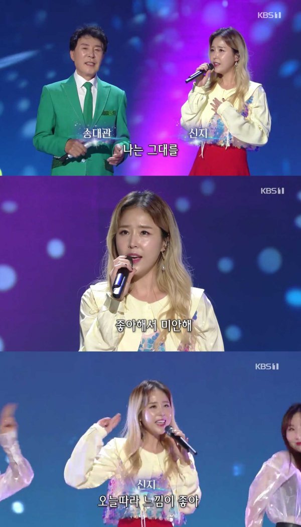 코요태의 신지가 15일 KBS 1TV ‘가요무대’에 출연해 흥 넘치는 무대를 선사했다. 이날 신지는 대선배 송대관과 함께 ‘사랑해서 미안해’를 듀엣 무대로 선사해 색다른 케미를 뽐냈다. 두 사람이 함께 부른 ‘사랑해서 미안해’는 지난 2004년 발매된 후 꾸준히 대중들의 사랑을 받았다.