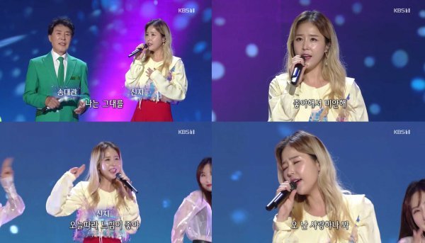 코요태의 신지가 지난 15일 KBS 1TV ‘가요무대’에 출연해 흥 넘치는 무대를 선사했다. 이날 신지는 대선배 송대관과 함께 ‘사랑해서 미안해’를 듀엣 무대로 선사해 색다른 케미를 뽐냈다. 두 사람이 함께 부른 ‘사랑해서 미안해’는 지난 2004년 발매된 후 꾸준히 대중들의 사랑을 받았다.