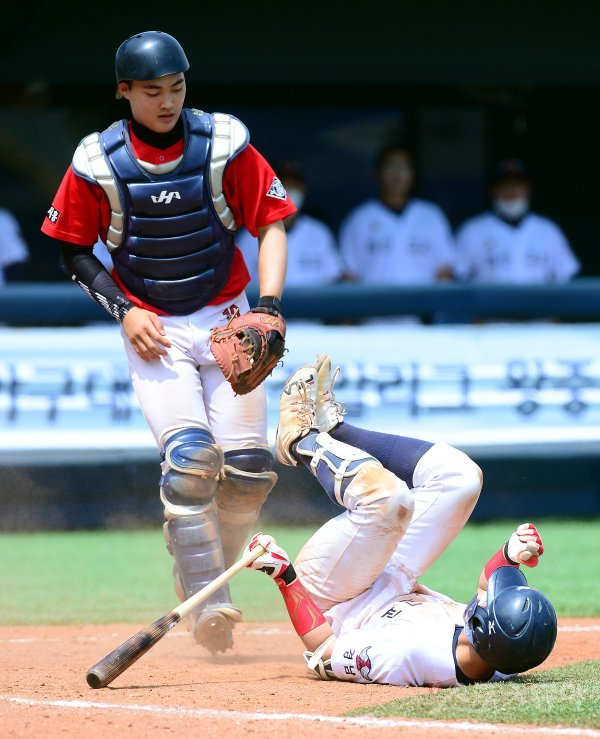 16일 서울 목동야구장에서 ‘제 74회 황금사자기 전국고교야구대회 겸 주말리그 왕중왕전’ 시흥 소래고등학교와 창원 마산고등학교의 경기가 열렸다. 6회말 2사 2, 3루에서 마산고 이현국이 헛스윙 삼진 아웃을 당한 뒤 그라운드에 넘어지고 있다.