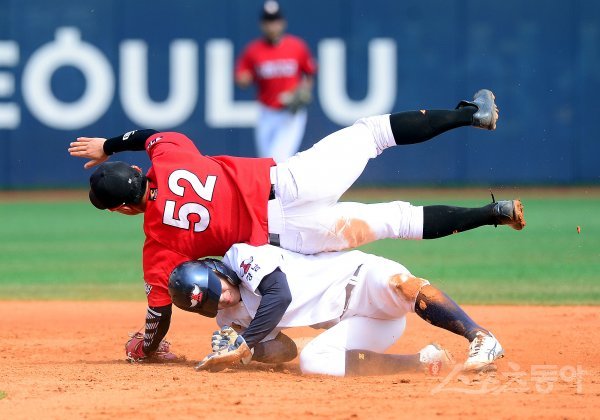 16일 서울 목동야구장에서 ‘제 74회 황금사자기 전국고교야구대회 겸 주말리그 왕중왕전’ 시흥 소래고등학교와 창원 마산고등학교의 경기가 열렸다. 3회말 1사 1, 2루에서 마산고 정선우의 내야 땅볼 때 소래고 송세준이 1루 주자 최현욱을 2루에서 포스 아웃시킨 뒤 충돌하고 있다.