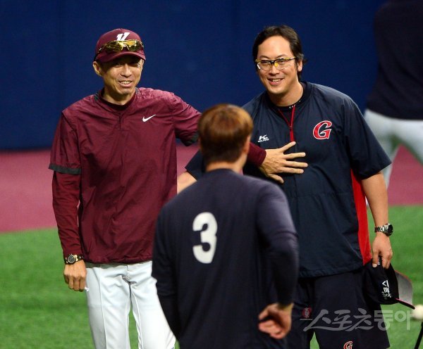 키움 손혁 감독이 SK 시절 함께 일했던 롯데 김민 통역과 웃으며 인사하고 있다.