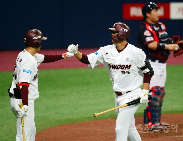 5회말 2사 1루 키움 허정협이 좌월 2점 홈런을 날린 뒤 박준태와 기쁨을 나누고 있다.