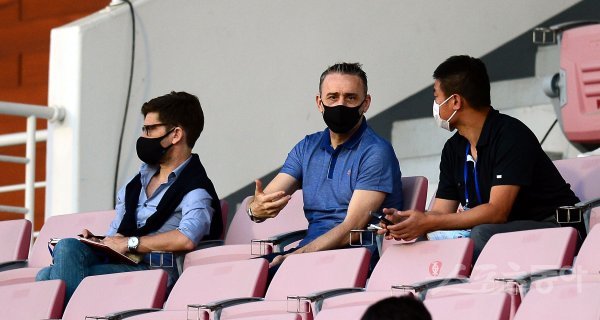16일 강릉종합운동장에서 열린 프로축구 ‘하나원큐 K리그1 2020’ 2위 울산현대와 3위 강원FC 경기에서 벤투 축구대표팀 감독이 경기를 관전하며 이야기를 나누고 있다.